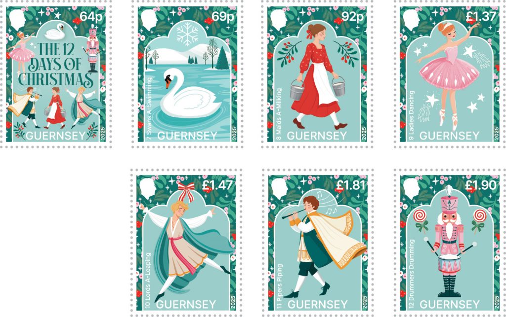 Meanwhile, Guernsey’s stamps complete the story, illustrating verses seven through to 12. The designs feature dancers, a swan, milkmaid and a drummer, with each stamp sharing a festive background of seasonal greenery and soft winter tones.