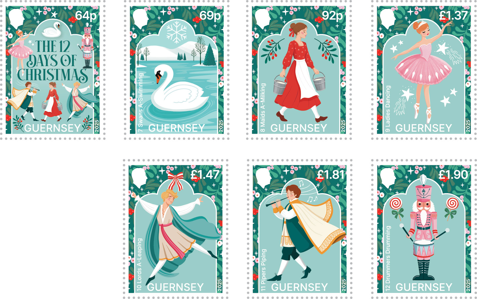 Meanwhile, Guernsey’s stamps complete the story, illustrating verses seven through to 12. The designs feature dancers, a swan, milkmaid and a drummer, with each stamp sharing a festive background of seasonal greenery and soft winter tones.