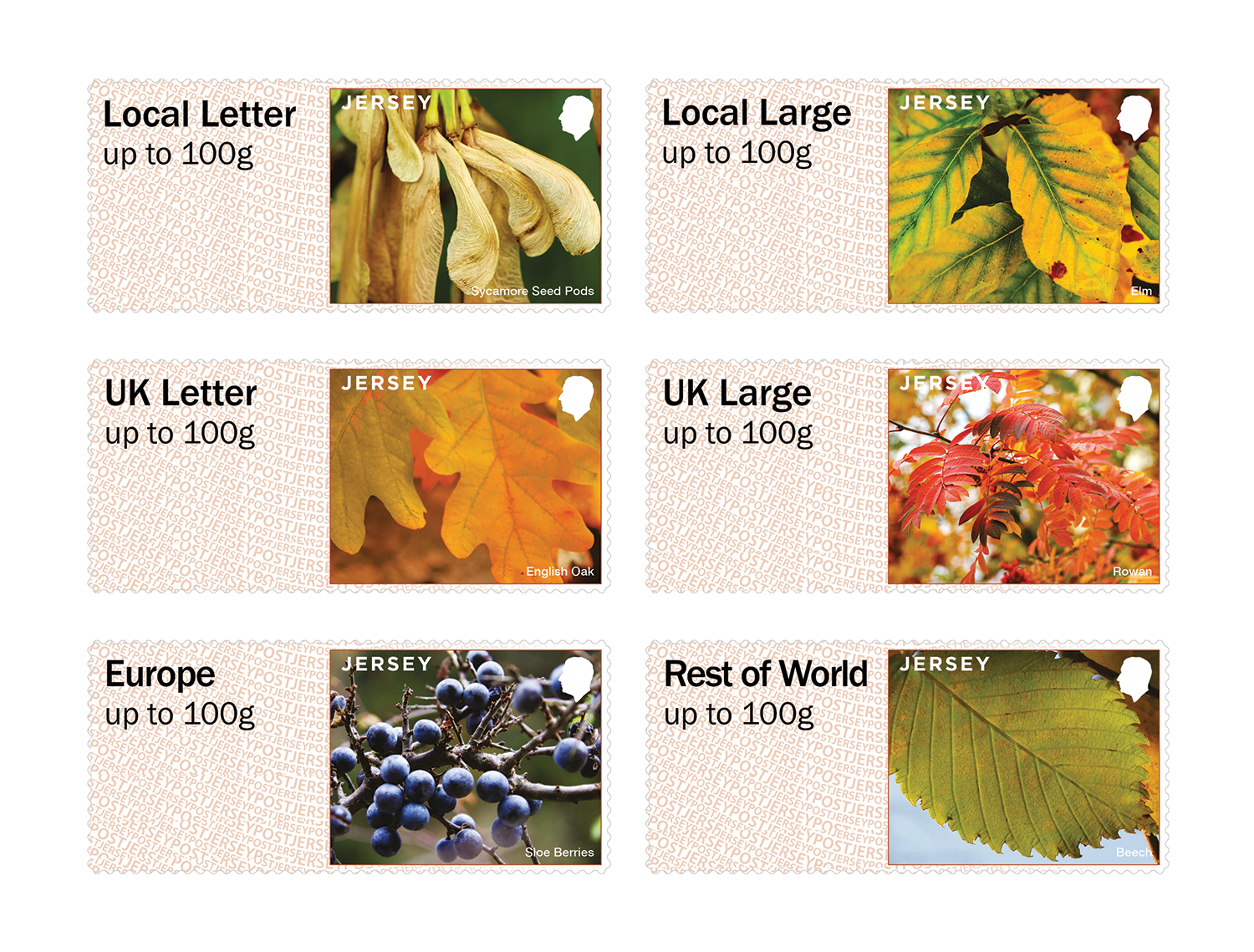 Celebrate the rich and rustic colours of nature in Jersey Post’s Post & Go: Colours of Autumn stamp issue. Available from Tuesday 30 September 2025, the self-service stamps feature six different types of woodland foliage found across the island.