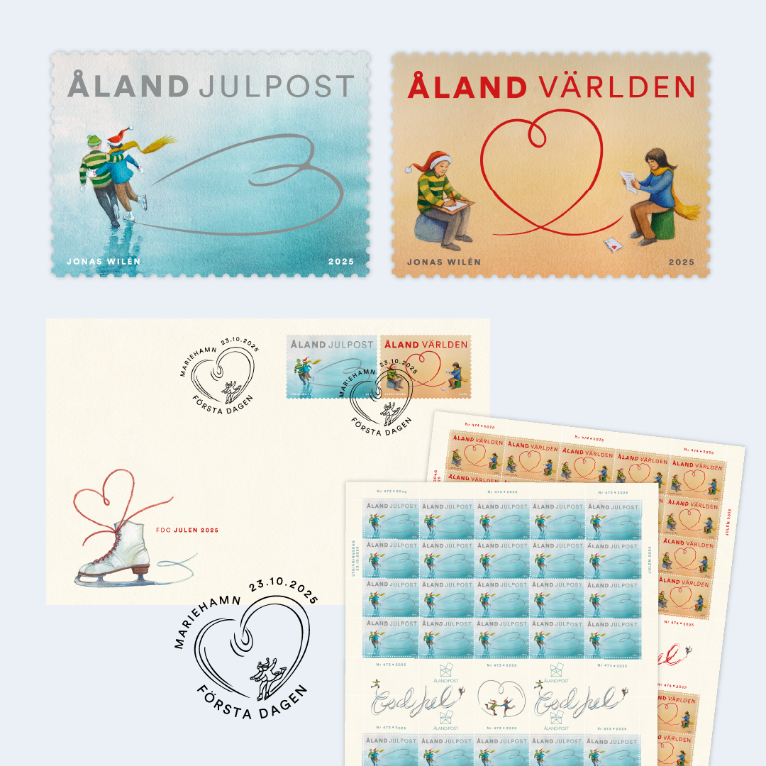 This year’s Christmas edition also includes a sheet of self-adhesive Christmas seals for decorating cards and packages, designed by Jonas Wilén on the theme of togetherness. The surplus from the sale of Christmas seals goes to charitable causes in Åland, and the beneficiary will be presented in a separate press release later this autumn.
